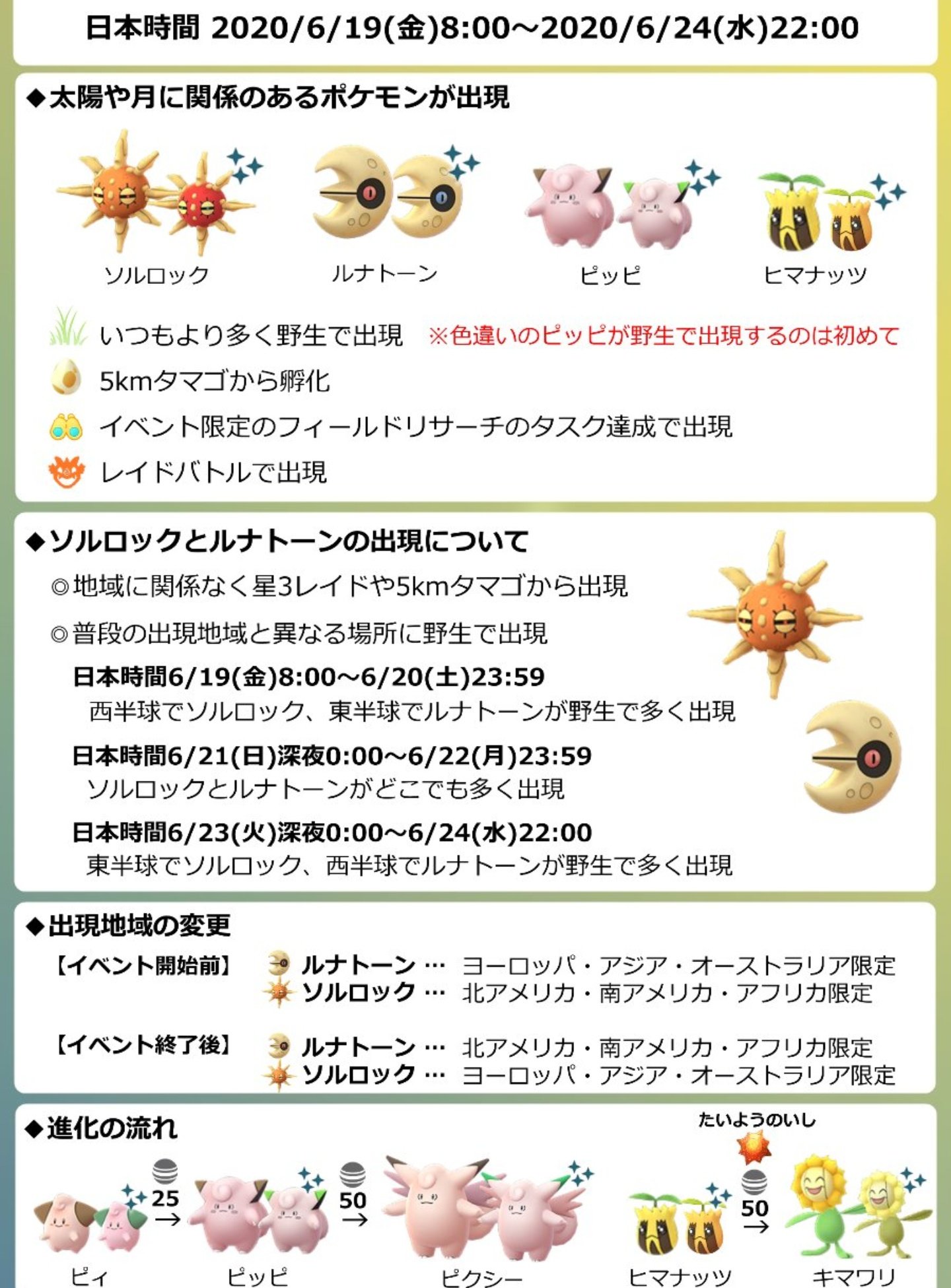 やぶおか 明日からポケモンgo で新イベント 季節イベント がスタートする やはり狙うは 色違いのソルロック 色違いのルナトーン の2体 ソルロックは地域限定ポケモンやから 何とかgetしたい 日本では 19日 日 ルナトーンが多く出現 21日 22日